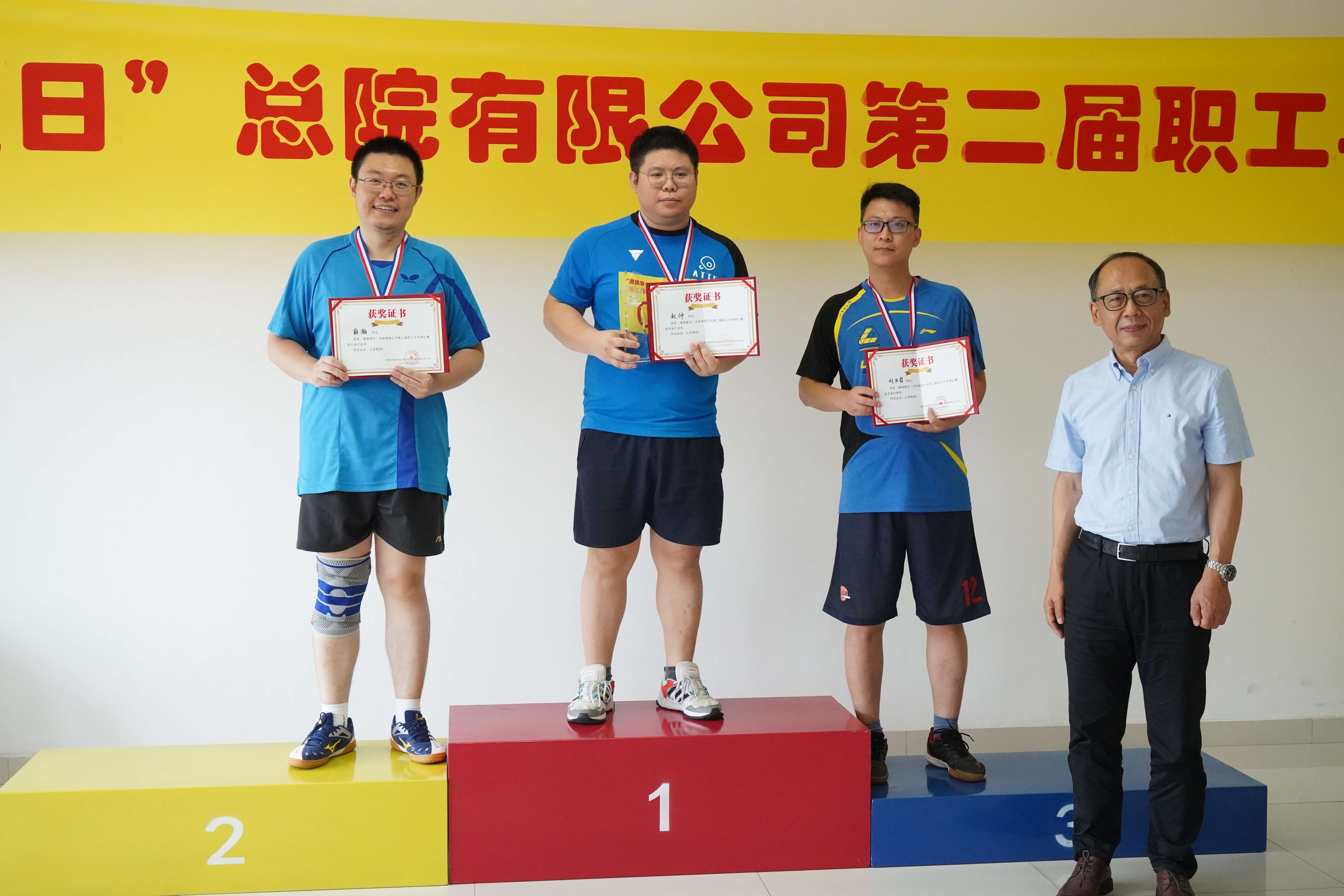 經過三天中午的角逐,在強手如林的男單比賽中,設計八院趙帥技壓群雄,一舉奪得冠軍。女單比賽中,選手們表現出昂揚向上的精神風貌和靚麗風采,最終設計三院周璐奪得了冠軍。雙打比賽的選手們也展現了精湛的球技和良好的心理素質,設計八院的趙帥和孫峣奪得男子雙打冠軍,設計三院的周璐和王聰收獲混合雙打冠軍。本屆比賽新設置的趣味迷你乒乓球團體賽也吸引了眾多高手參加,冠軍最后由規劃二院的王恩來、盧杰和保護規劃所的曹紫佳奪得。正式比賽結束后,孫永利總經理與剛剛奪得男子單打冠軍的趙帥進行了一場表演賽,兩人的精彩球技贏得一陣陣喝彩。最后進行了隆重的頒獎儀式,領導們為獲獎選手頒發了獎杯、獎牌和證書并合影留念。本屆比賽在拉德斯基進行曲的歡快節奏中圓滿結束。