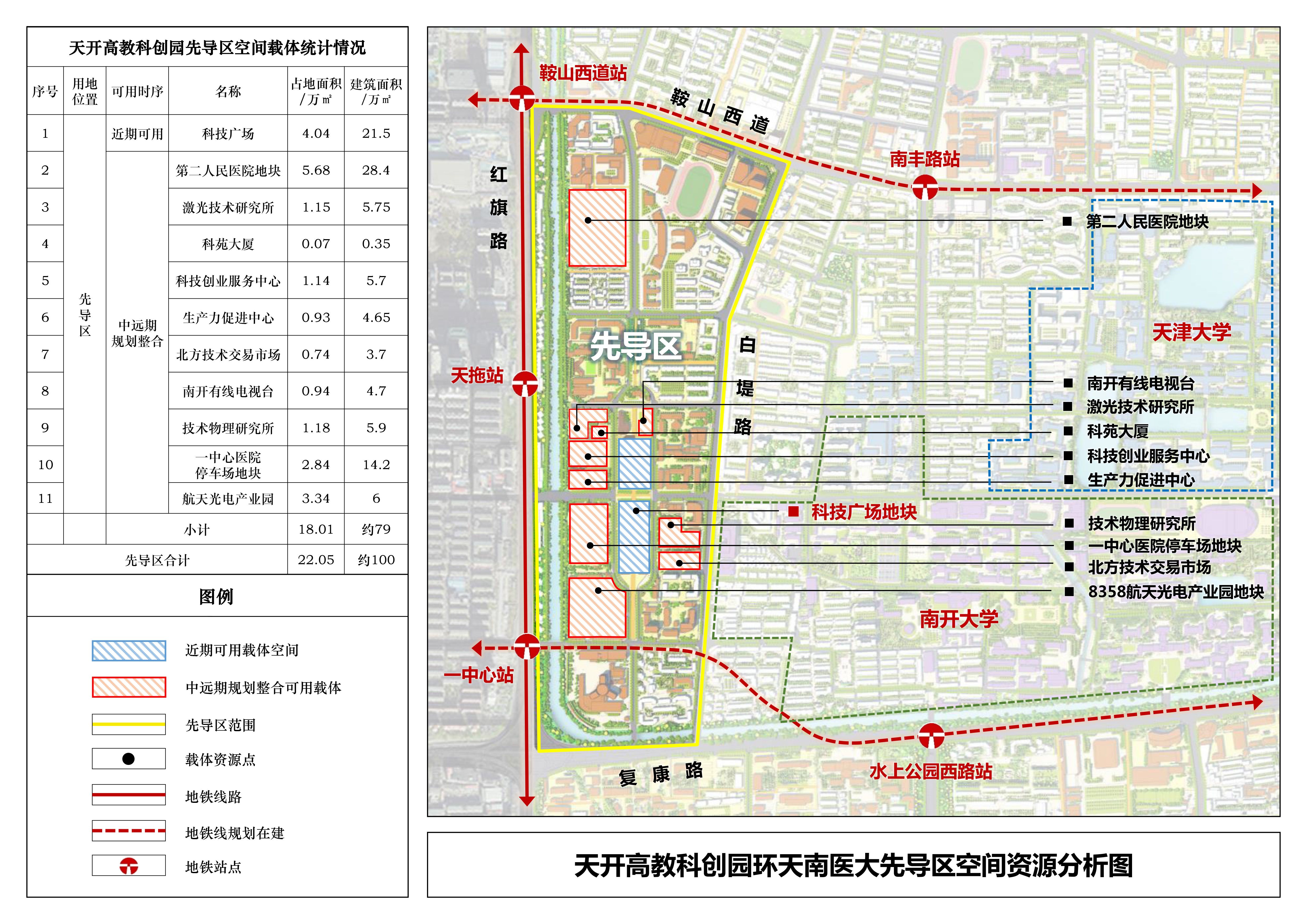 核心區內劃定“鞍山西道—白堤路—復康路—紅旗路”合圍區域為先導區,占地面積約1.1平方公里。以天津科技廣場為核心、科研西路為中軸向兩側延伸的11個空間載體為主要供給,可提供總占地面積22.05萬平方米、總建筑面積100余萬平方米的載體空間。