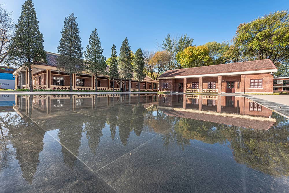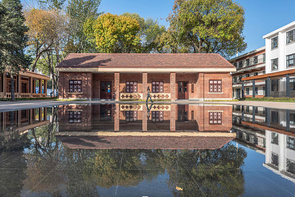 蘇聯(lián)專家樓會議室作為一機床廠史館,內(nèi)部以一機床廠整體工業(yè)化發(fā)展變革為核心,展示原有的工藝生產(chǎn)過程,體現(xiàn)一機床廠的輝煌歷史。景觀在設計中考慮在不影響建筑風格同時,在中心位置設計一方靜水,形成四水歸堂、水聚天心別具的景觀風格。水面中映襯的建筑倒影,使得整個場地更加靈動。