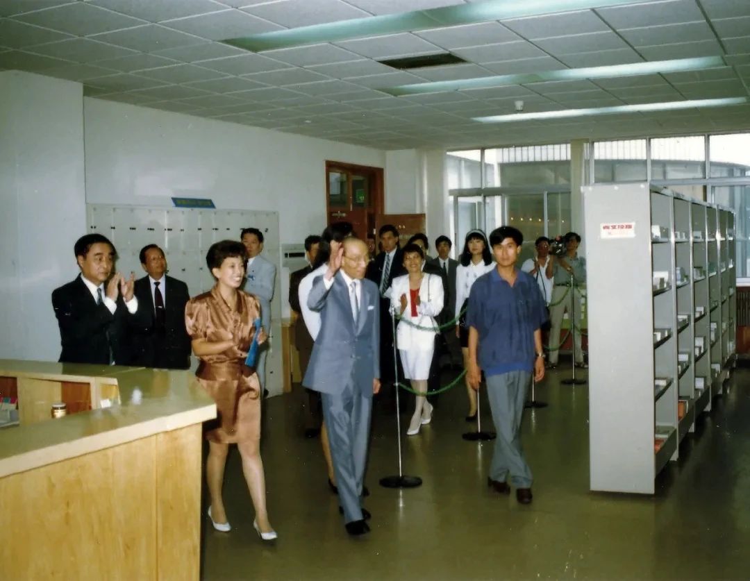 1992年8月15日,邵逸夫先生和方逸華女士一行在市領導錢其傲和校領導吳詠詩的陪同下,來到科學圖書館參觀