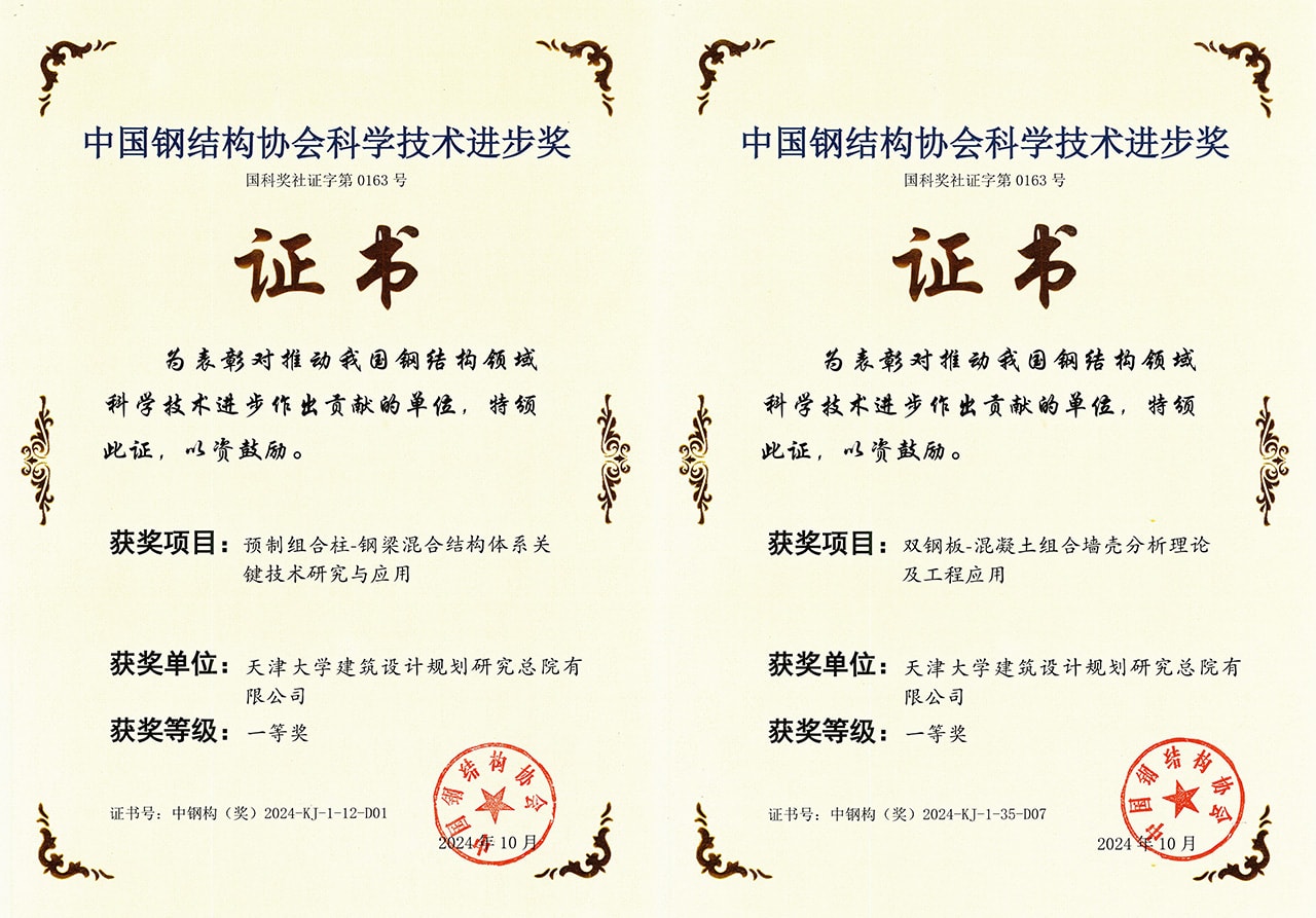 2024年10月21日-22日,“中國鋼結(jié)構協(xié)會成立40周年大會暨2024中國鋼結(jié)構大會”在北京召開,會議頒發(fā)了2024年度中國鋼結(jié)構協(xié)會科學技術進步獎。此次大會匯聚了多位院士、勘察設計大師和行業(yè)領袖,超過800名專家和代表共同見證這一歷史時刻。天津大學建筑設計規(guī)劃研究總院有限公司牽頭完成的“預制組合柱-鋼梁混合結(jié)構體系關鍵技術研究與應用”和參與完成的“雙鋼板-混凝土組合墻殼分析理論及工程應用”兩項成果榮獲2024年度中國鋼結(jié)構協(xié)會科學技術進步一等獎。