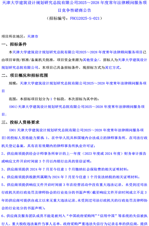 天津大學(xué)建筑設(shè)計規(guī)劃研究總院有限公司?2025~2028年度常年法律顧問服務(wù)項目競爭性磋商公告