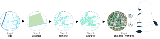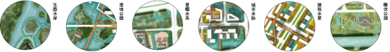 以龍鳳河為基底,結(jié)合起步區(qū)現(xiàn)狀“河-塘-溝-渠”搭建藍(lán)綠網(wǎng)絡(luò),打造多元親水公共空間,營造生態(tài)水城