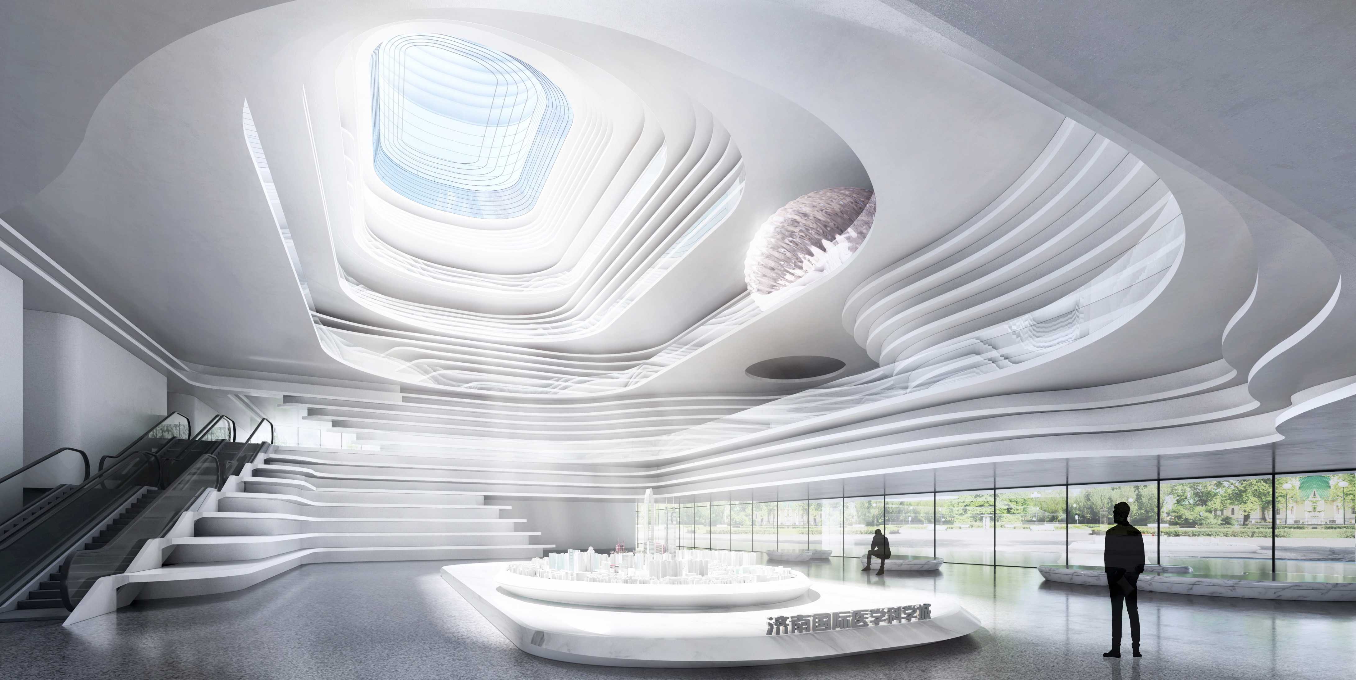 展示中心內(nèi)部仿佛蘊(yùn)藏著無限奧秘的“醫(yī)學(xué)秘境”,簡潔的建筑表皮下蘊(yùn)含著精彩豐富的室內(nèi)空間,充滿趣味和變化。本項(xiàng)目總建筑面積80000平方米,其中地上57000平方米,地下23000平方米,包含醫(yī)學(xué)科學(xué)創(chuàng)新體驗(yàn)、醫(yī)學(xué)科學(xué)成果展示、濟(jì)南醫(yī)學(xué)科學(xué)城規(guī)劃與園區(qū)成果展示、醫(yī)學(xué)會議交流、醫(yī)學(xué)研究、創(chuàng)新孵化、醫(yī)學(xué)多功能展示服務(wù)等功能空間,是一個(gè)具有復(fù)合性、標(biāo)志性和示范性的醫(yī)學(xué)科學(xué)體驗(yàn)展示中心。