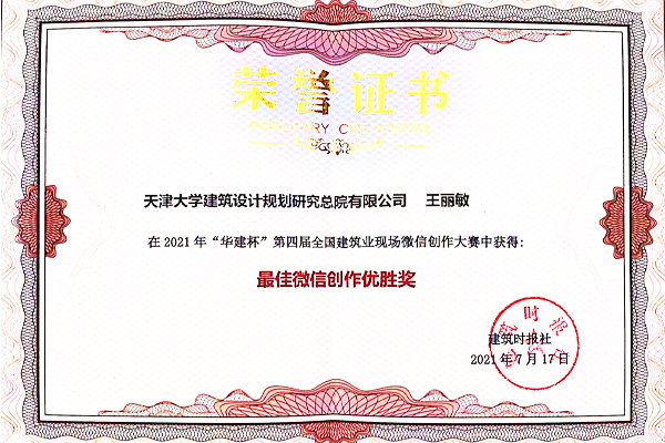 會上,天津大學建筑設計規劃研究總院有限公司運營的“AATU天大設計總院”微信公眾號獲得2021年全國建筑業“優秀微信公眾號”,市場品牌部副部長張璐代表總院有限公司上臺領取獲獎證書。該榜單根據2020年度共計五百余家全國建筑行業微信公眾號的運營情況申報,經報社評委會結合公眾號后臺數據,以媒體影響力、發布文章質量和點擊閱讀數等多項權威指標綜合評定。