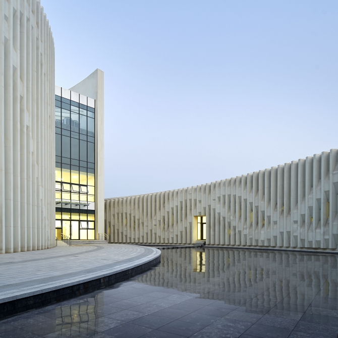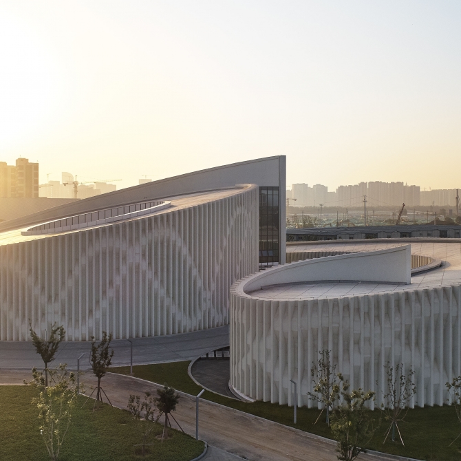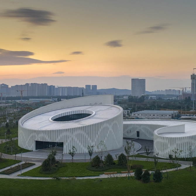 山東第一醫(yī)科大學醫(yī)學博物館呈現(xiàn)一種簡單、靜謐,形式內(nèi)向而又富有活力和動感的建筑意向。它歡迎人們進入、感受生命的神奇。高低起伏、螺旋向上的層次感帶來豐富的空間感受,同時這種向上的狀態(tài)似乎在傳達生命積極向上的姿態(tài)、講述生命的力量。同時,曲線的建筑姿態(tài)呈現(xiàn)一種柔美的空間形態(tài),與螺旋向上的建筑立面相結(jié)合。我們希望傳達的是生命的柔與剛、靜與動、矛盾與和諧。