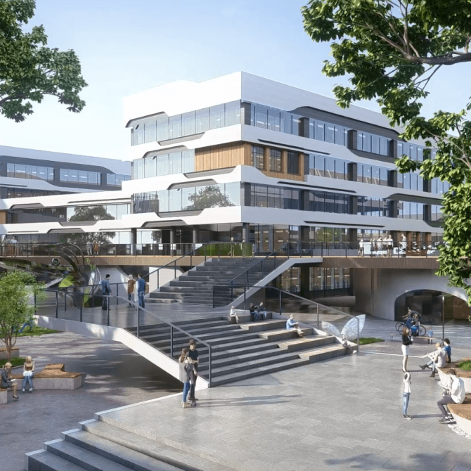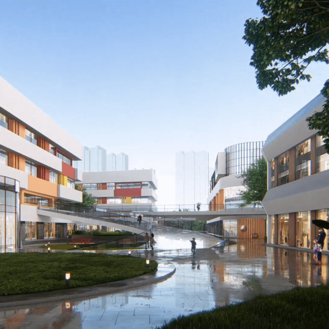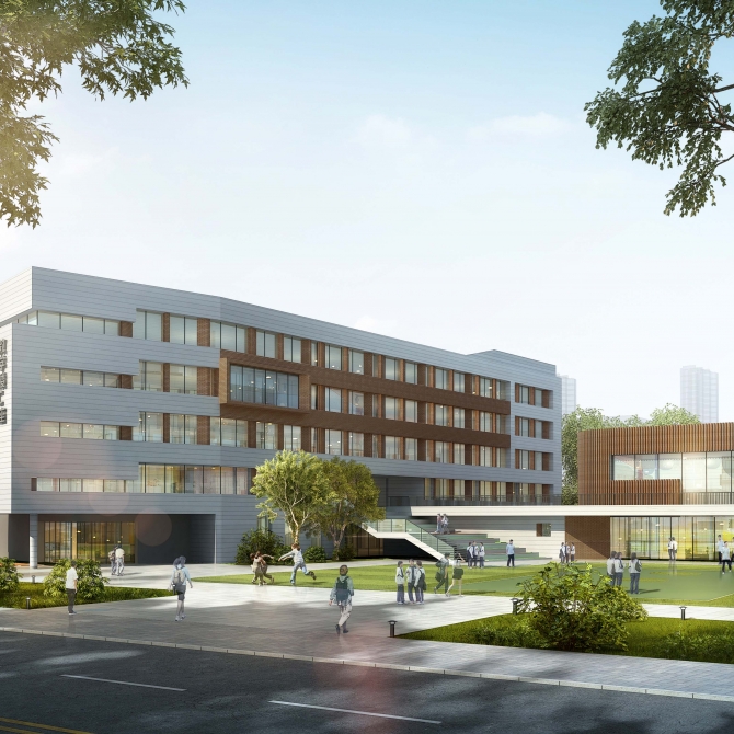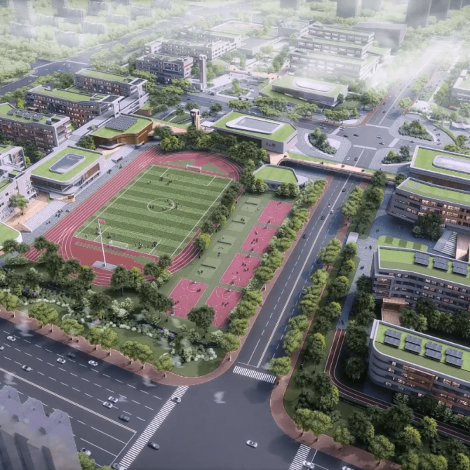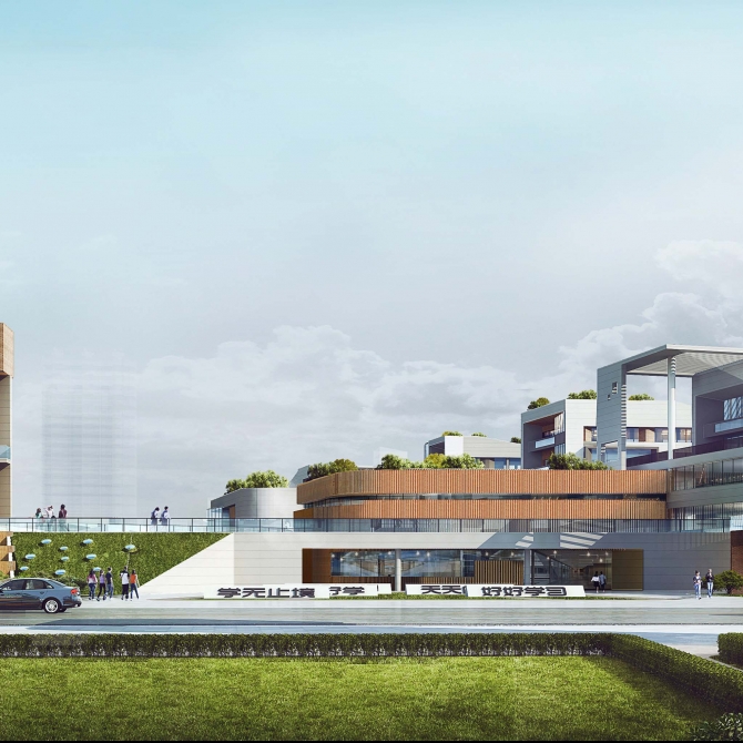 總體布局,景觀公園、大禮堂、游泳館、圖書綜合樓等重要公共建筑居中布置,形成中心共享區,共享區為四個校區同時服務,增加了校園功能場館的使用效率,亦可與社會開放,形成校城共享。高中、初中、小學、幼兒園四所學校分布四周,環繞簇擁,重要建筑形象均向城市展示,凸顯校園品質。