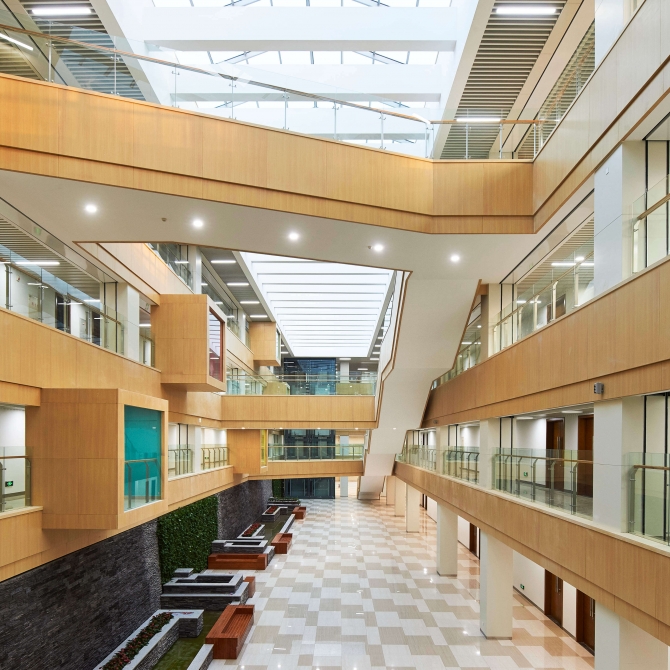 運用空間上起承轉合、連續拓撲變化的折板,形成富有層次的天際線,一氣呵成。建筑立面材料選用硬朗線條突出的石材與鋁板,現代氣息濃郁,再經錯動點綴的橫向與縱向遮陽板使立面更為豐富。