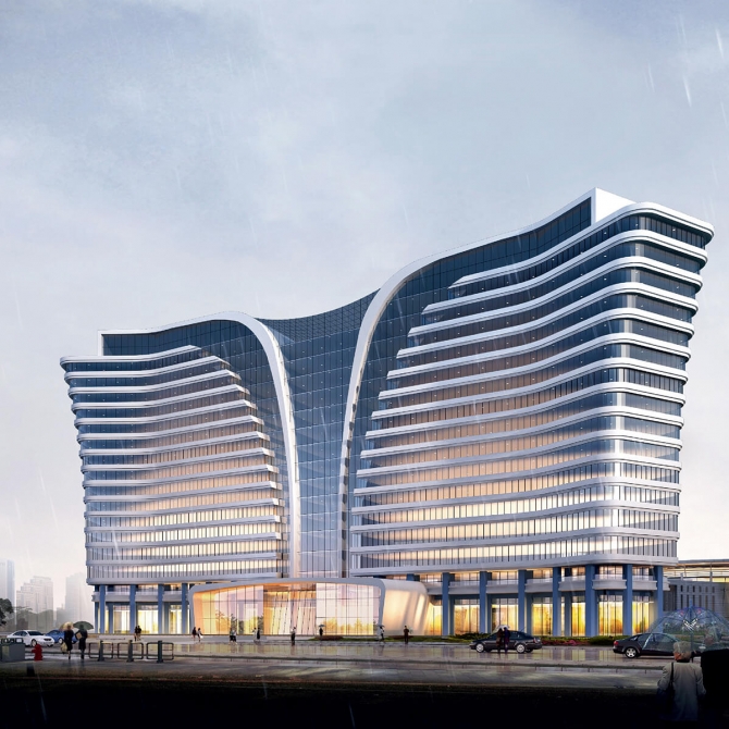 建筑組群中以“龍鳳呈祥”意向的建筑實(shí)軸與“山水相依”意向的景觀虛軸為空間構(gòu)架,兩軸線相得益彰,構(gòu)圖豐滿有序。建筑群體通過一個曲線形的玻璃景觀風(fēng)雨連廊將門診樓、病房樓專科醫(yī)院、辦公區(qū)、老年保健院的四個組團(tuán)串聯(lián)起來,各個組團(tuán)相互聯(lián)系,并相對獨(dú)立,使用方便。