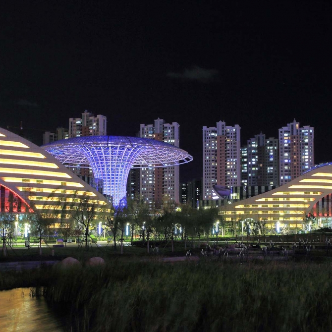 本次設計以 “海之和樂——共奏開發區30年輝煌歷程”的浪漫主義形象作為設計主旨,將自然、文化、科技融為有機的整體,在體現煙臺開發區特有風貌的同時,建立良好的生態景觀環境。