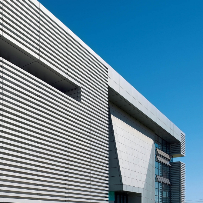 天津工業(yè)大學(xué)前身是紡織學(xué)院。本場(chǎng)館在建筑外表皮的設(shè)計(jì)中運(yùn)用多種線條編織手法,再現(xiàn)紡織理念。鋁合金板材的各種選型精心搭配,形成了多樣化的機(jī)理模式。建筑西側(cè)的主入口空間采用金色鋁方通折板結(jié)構(gòu),巨大的挑檐突顯了宏偉的氣勢(shì)。建筑金色與金屬色的合理運(yùn)用與周邊體育館的色調(diào)相匹配,強(qiáng)調(diào)了體育中心的整體感。西側(cè)主墻面上點(diǎn)綴很多不銹鋼拋光格片,在天光的照射下熠熠生輝,給場(chǎng)館建筑增添許多靈動(dòng)之感。南北西側(cè)玻璃幕墻與金屬楔形結(jié)構(gòu)互相穿插構(gòu)成了側(cè)面入口的趣味空間,豐富的表情加強(qiáng)了本場(chǎng)館與周邊環(huán)境的對(duì)話關(guān)系。