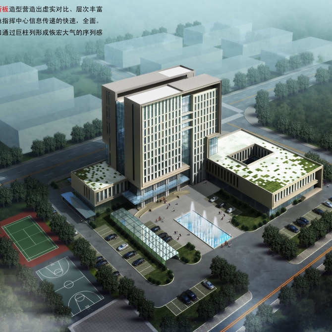 項目采用主樓加裙房的布局方式,主樓11層,裙房2層,地下1層。主要功能為測繪指揮中心、國土局等對外服務和指揮功能。采用高效率的平面結構,形成通高的中庭空間,將陽光引入建筑室內。地下室為人防及設備用房,平時作為車庫使用,可停放約80輛機動車。