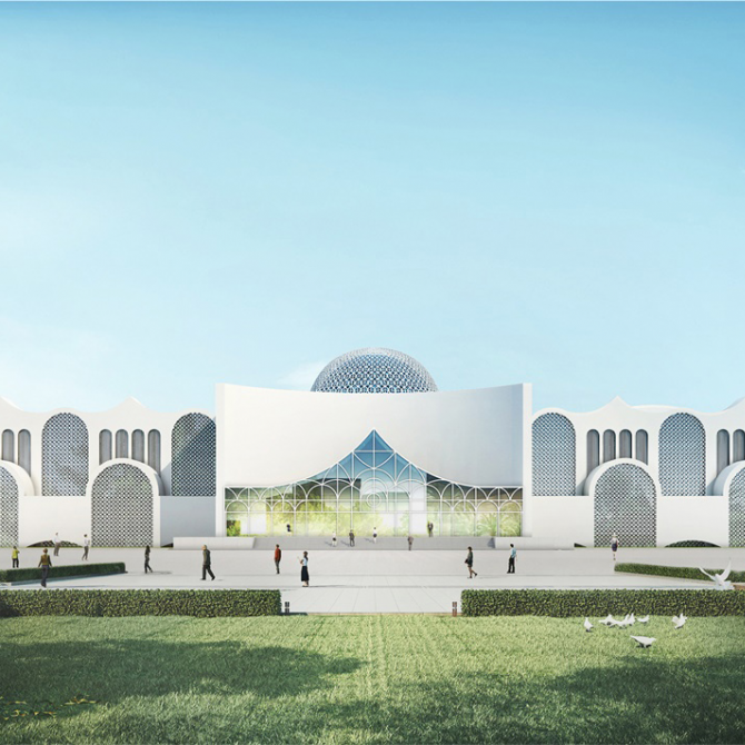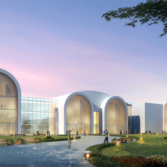 博物館創(chuàng)意取材于新疆特有的地域民族文化符號,將原有建筑立面加以簡單改造,通過透明綠化的中央共享大廳將新老建筑無縫相連。充滿現(xiàn)代活力氣息的白色建筑展現(xiàn)出源于西域民族特色和地域文化獨(dú)有的特殊美感。通過圓拱和尖圈的前后交織,左右錯(cuò)動(dòng),形成極具樂感韻律的立面造型,構(gòu)成建筑的多重性格。