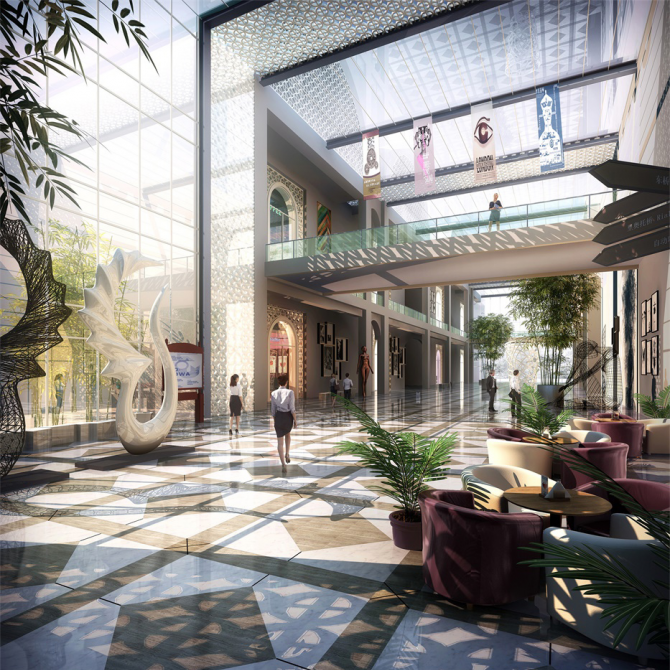 利用建筑造型,打造高低錯(cuò)落的剖面形態(tài)。各個(gè)展廳圍繞中心綠色共享大廳展開,通過一系列連續(xù)的拱形門洞,形成特有的框景、透景的藝術(shù)效果,為參觀者打造步移景異、收放有序的觀展空間。
