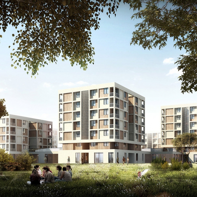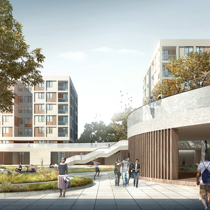 項(xiàng)目位于天津市西青區(qū)天津師范大學(xué)新校區(qū)內(nèi),總建筑面積12500平方米,滿(mǎn)足380位留學(xué)生入住。本案位于校園北側(cè),其主要人流來(lái)自南側(cè)教學(xué)區(qū)和生活區(qū)。廣場(chǎng)出入口處設(shè)接待中心,醒目便捷。廣場(chǎng)內(nèi)部實(shí)行人車(chē)分流,僅允許行人和非機(jī)動(dòng)車(chē)進(jìn)入,行人亦可通過(guò)首層架空灰空間到達(dá)校園主環(huán)路及校園濕地景觀。優(yōu)美弧線(xiàn)的室外觀景平臺(tái),宛如一條紐帶將錯(cuò)落有致的宿舍有機(jī)聯(lián)系到一起,內(nèi)側(cè)形成一個(gè)半圍合的景觀庭院。本案采用白色和仿木紋水泥纖維板作為建筑外檐材料。通過(guò)簡(jiǎn)潔的白色骨架,木色和白色相間的建筑墻面的設(shè)計(jì)元素和手法,體現(xiàn)中式匠心獨(dú)運(yùn)的文化內(nèi)涵。