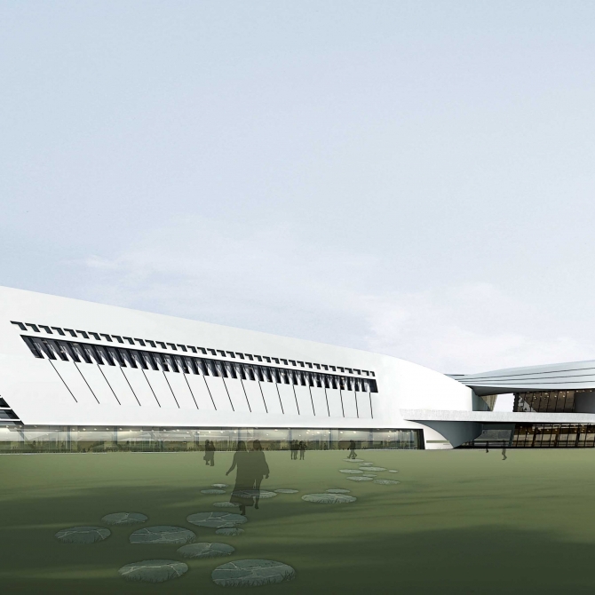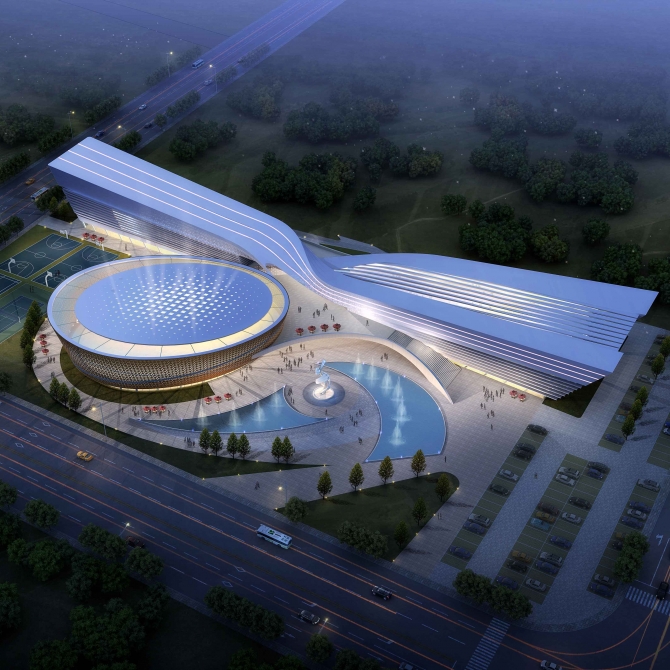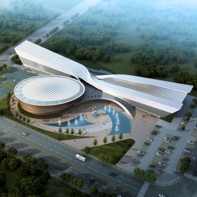 建筑方案以“新絲綢之路上的明珠”作為設計主題。方案完美地契合了長方形用地,基地南端擁有力量感與飄逸身姿的矩形體量舒展靈動,是對新絲綢之路的理想隱喻。水平的線條與建筑修長的體型相呼應,設計手法簡練一氣呵成。建筑的北側是一個橢圓形體量,氣勢恢宏造型獨特,猶如明珠的外觀在夜幕降臨、華燈初上之時璀璨奪目,彰顯了霍爾果斯市在新絲綢之路上的的顯赫地位。