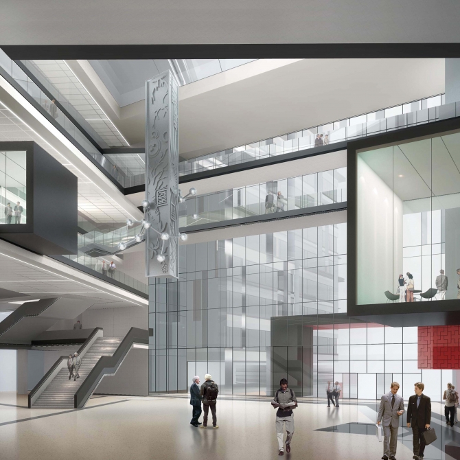 我們在設計中要充分考慮兩種基本模式的優缺點,有機整合兩種模式的優點,形成“三枝”層層跌落的組合布局模式,高分子工程科學與工程學院、材料與工程學院、待定學院各占一枝,交叉處為中心共享大廳。該科研大樓垂直的功能從公共開放到私密獨立順勢展開,形成從水平和垂直功能上的合理布局。北高南低的建筑形體,節省了最寶貴的校園用地,為南側未來校園再次建設創造最有利的基礎。西側高東側低的形體變化使得建筑在城市道路上具有標志性,對校園建筑形成最小的壓抑和影響。
