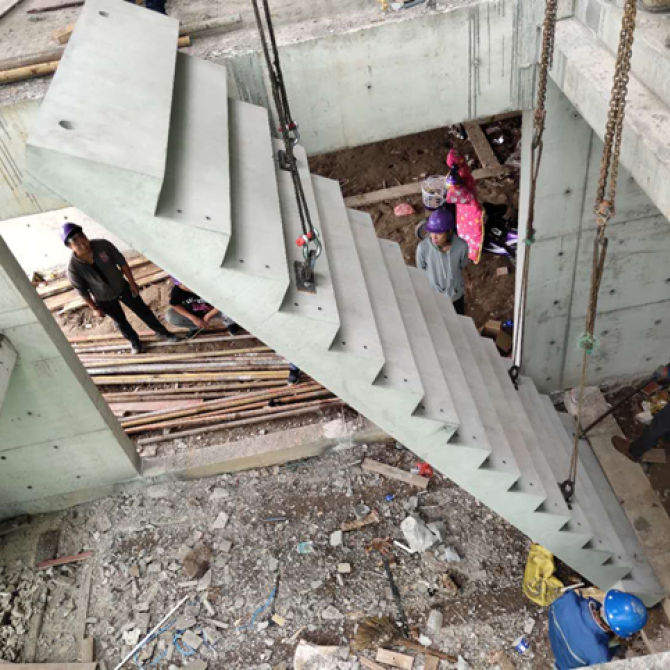 預(yù)制樓梯機械化施工程度更高,預(yù)制樓梯在工廠整體為清水混凝土澆筑,外表肌理異常細密,無需再做裝飾面。預(yù)制樓梯宜通過鋼筋直錨入疊合樓板現(xiàn)澆層部位,與主體形成可靠連接。