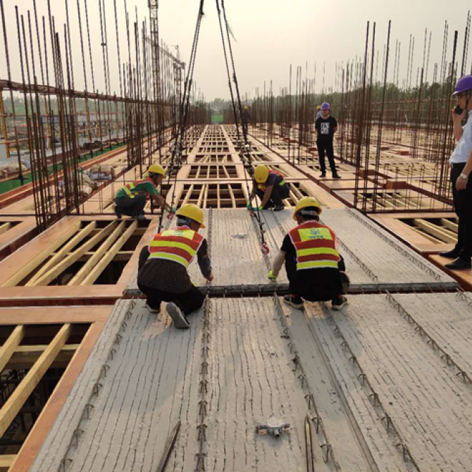 疊合板按照單向受力模型進行設(shè)計,最大程度節(jié)約了傳統(tǒng)樓板木模的使用,改良了樓板支模的施工工藝,縮短了施工周期,改善了施工環(huán)境,提高了施工的質(zhì)量和精度。