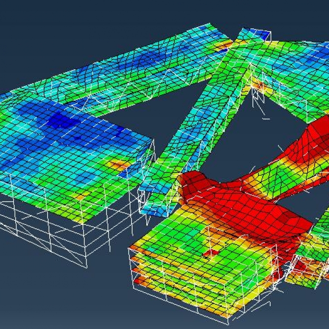 為滿足外圍無柱的建筑意圖,4個單體在底部都有切角,4個單體能落地的柱子較少,演奏廳、音樂廳及黑盒劇場均向外懸挑,懸挑桁架設置支撐,并與后方連廊桁架相連,從而防止傾覆。音樂學院結構體系復雜,根據結構特點,防倒塌分析是該結構設計的主要關注點,方案對整體結構進行靜力和地震作用下的全過程倒塌分析,分析結果表明結構設計合理,根據倒塌過程中的結構表現對結構布置提出了優化建議。