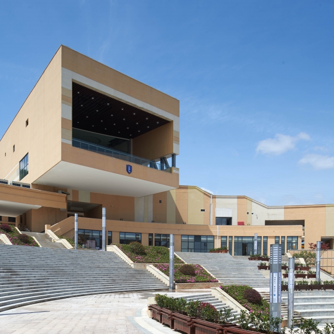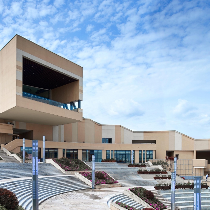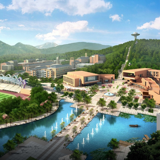 學生活動中心建設用地位于園區的東西主軸線與南北景觀大道交叉點上,風景宜人,處于園區的最佳位置,可供整個園區學生使用,風景宜人。北側國際學校區,南側普通教學區,東側景觀大道,西側為自然山體。總體地勢呈西高東低,東西高差9m。